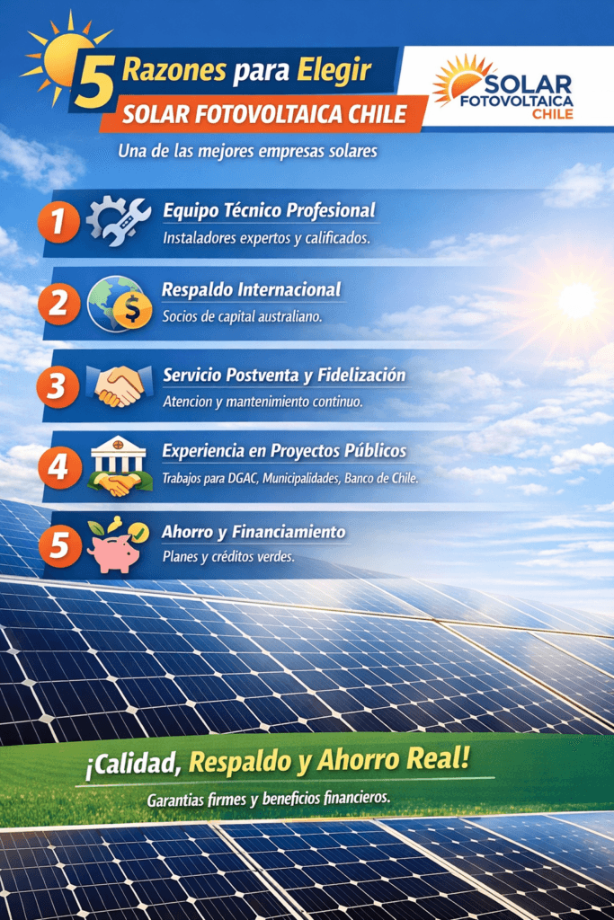 Claro 👍 Aquí tienes **5 razones concretas por las que muchos eligen a Solar Fotovoltaica Chile como una de las mejores opciones para instalar energía solar en Chile (especialmente si quieres calidad, respaldo y garantías sólidas): Solar Fotovoltaica